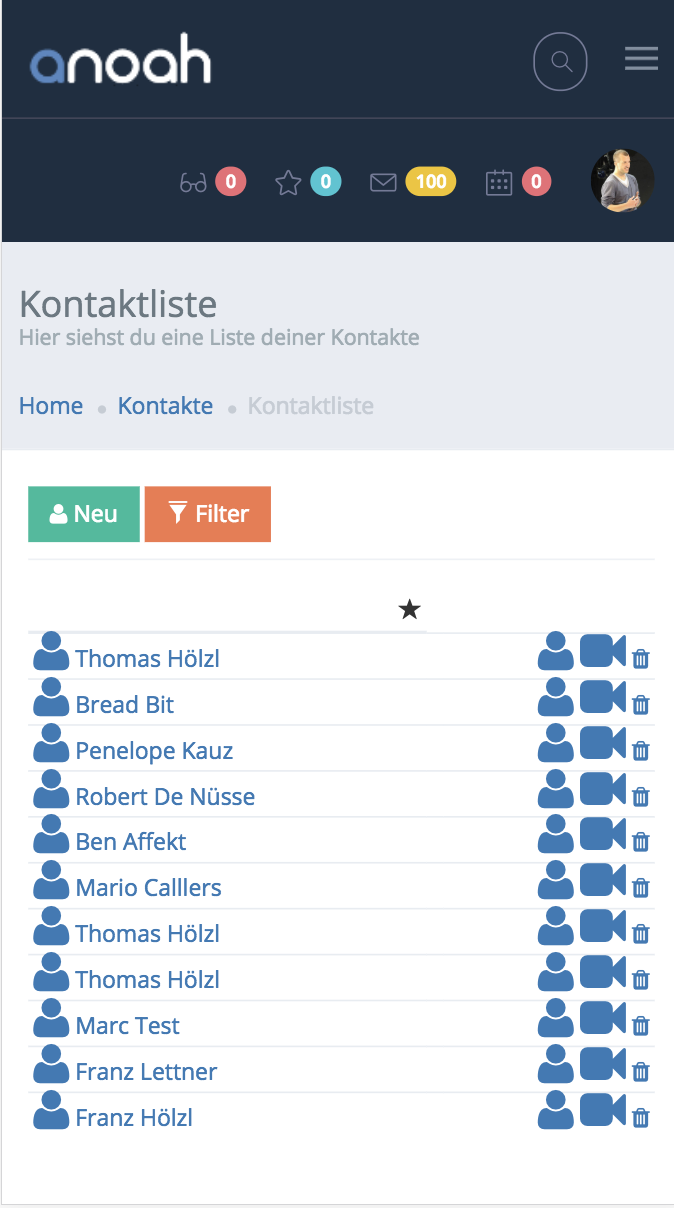 Diese Schritt entfällt wenn der Patient bekannt ist. Falls der aktuelle Patient noch nicht in der Liste ist kann man ihn über „NEU“ anlegen. Name, Nachname und E-Mail-Adresse sollten eingeben werden. Nach dem Anlegen landest man wieder in der Liste der Patienten.