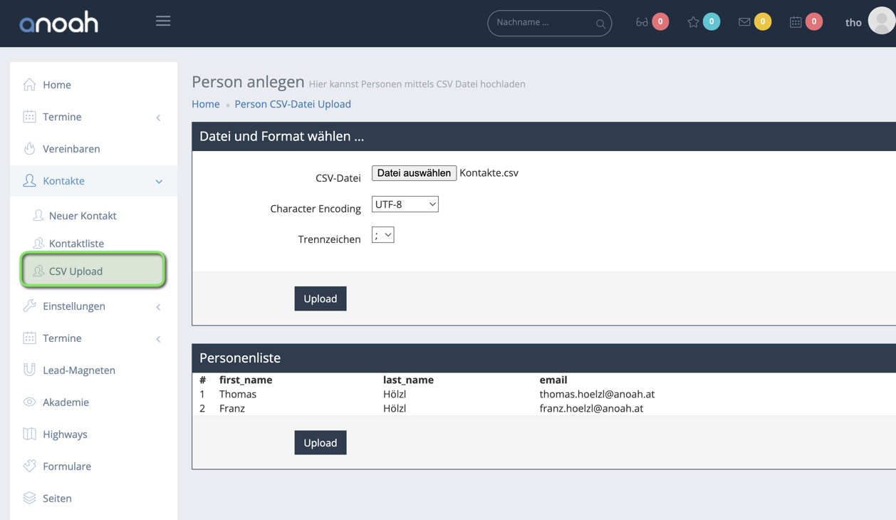 Wie du oben im Screenshot siehst zeigt anoah die Daten der CSV Datei an, bevor du sie mit einem Klick importieren - durch einen Klick auf ‘Upload’ - kannst. So kannst du prüfen ob alles korrekt übernommen wurde oder ob du noch wo Anpassungen vornehmen musst.