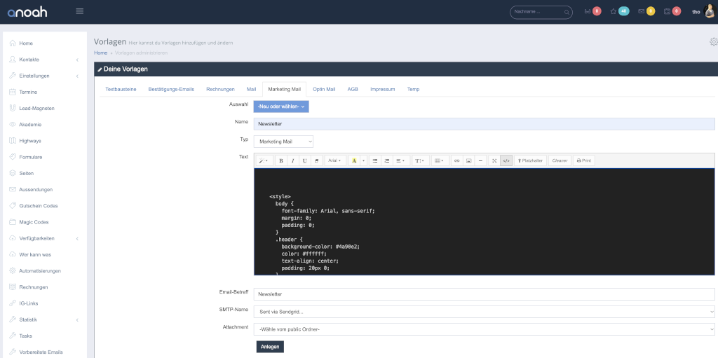 Das Wichtigste zuerst: Alles funktioniert weiterhin wie bisher! Der bekannte aNoah-Editor erstellt eine HTML-Datei. Der neue Editor - er heißt grapesjs - erstellt ebenfalls eine HTML. Das bedeutet für dich, als anoah Nutzer, dass z.b. Automatisierungen weiter wie auch bisher funktioneren. Der einzige Unterschied ist, der neue Vorlageneditor erlaubt dir, stylische und mobil optimierte Vorlagen, wie etwa Newslettervorlagen, zu gestalten. Deiner Kreativität sind keine Grenzen gesetzt.