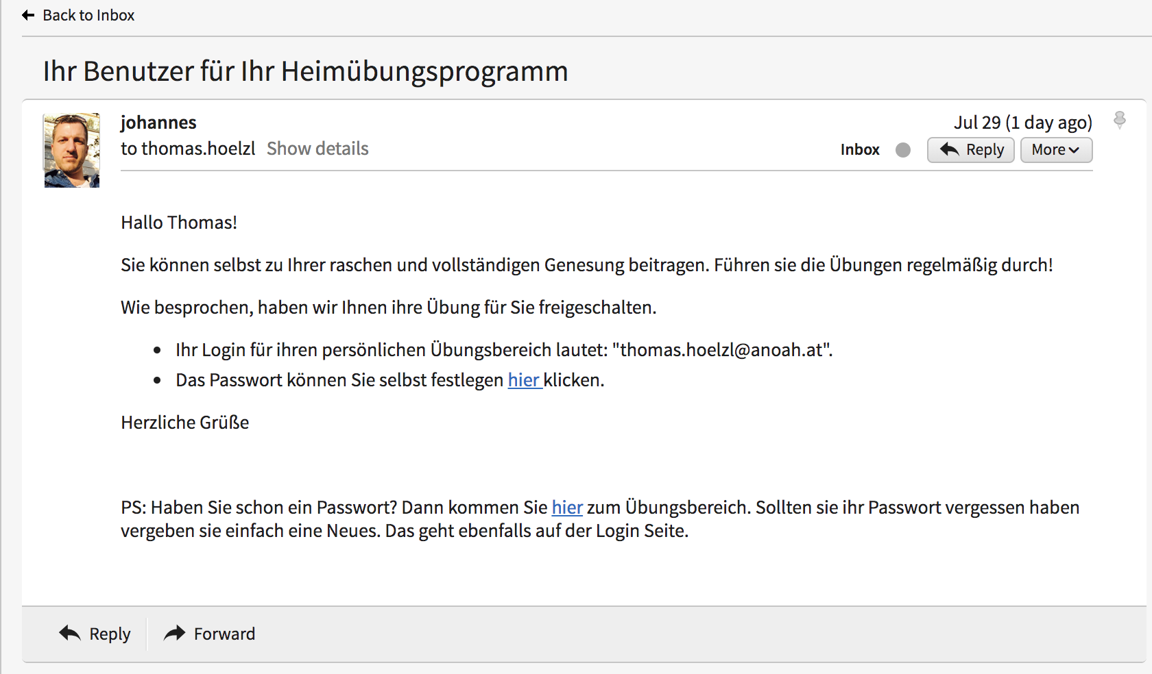 Nach der Therapieeinheit erhält der Patient eine E-Mail. Die E-Mail sieht in etwa so aus: