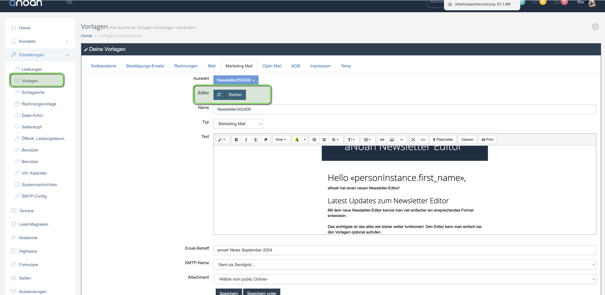 Der Editor befindet sich im Modul “Vorlagen”. Man kann ihn für jede existierende (oder neu angelegte) Vorlage aufrufen.Wenn du auf “Editor starten” klickst, wird der Editor mit dem Inhalt der Vorlage in einem neuen Fenster geöffnet.