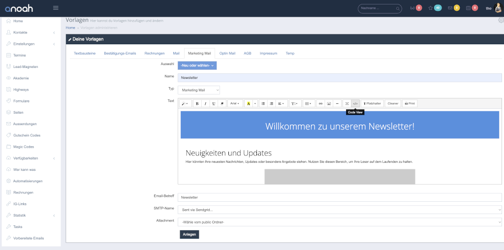 Das Wichtigste zuerst: Alles funktioniert weiterhin wie bisher! Der bekannte aNoah-Editor erstellt eine HTML-Datei. Der neue Editor - er heißt grapesjs - erstellt ebenfalls eine HTML. Das bedeutet für dich, als anoah Nutzer, dass z.b. Automatisierungen weiter wie auch bisher funktioneren. Der einzige Unterschied ist, der neue Vorlageneditor erlaubt dir, stylische und mobil optimierte Vorlagen, wie etwa Newslettervorlagen, zu gestalten. Deiner Kreativität sind keine Grenzen gesetzt.