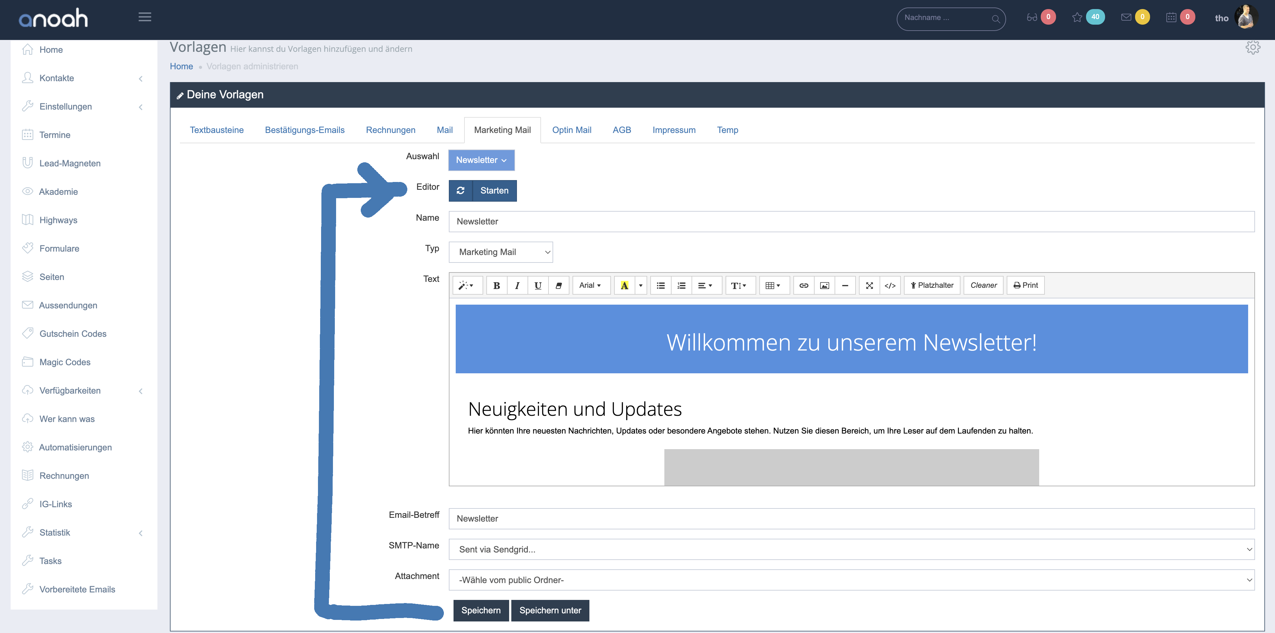 Wenn du die Variablen eingefügt hast und die Vorlage abgespeichert hast klickst du auf “Editor starten”.